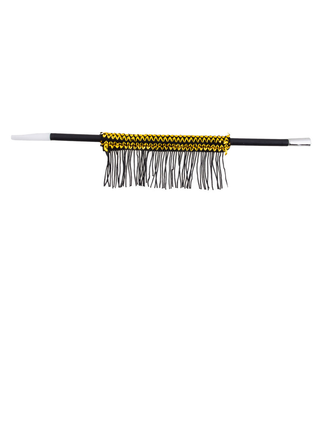 Deze sigarettenhouder voor volwassenen is zwart en is ongeveer 33,5 cm lang. Het is versierd met een decoratie van zwart en goudkleurig stof met franjes.