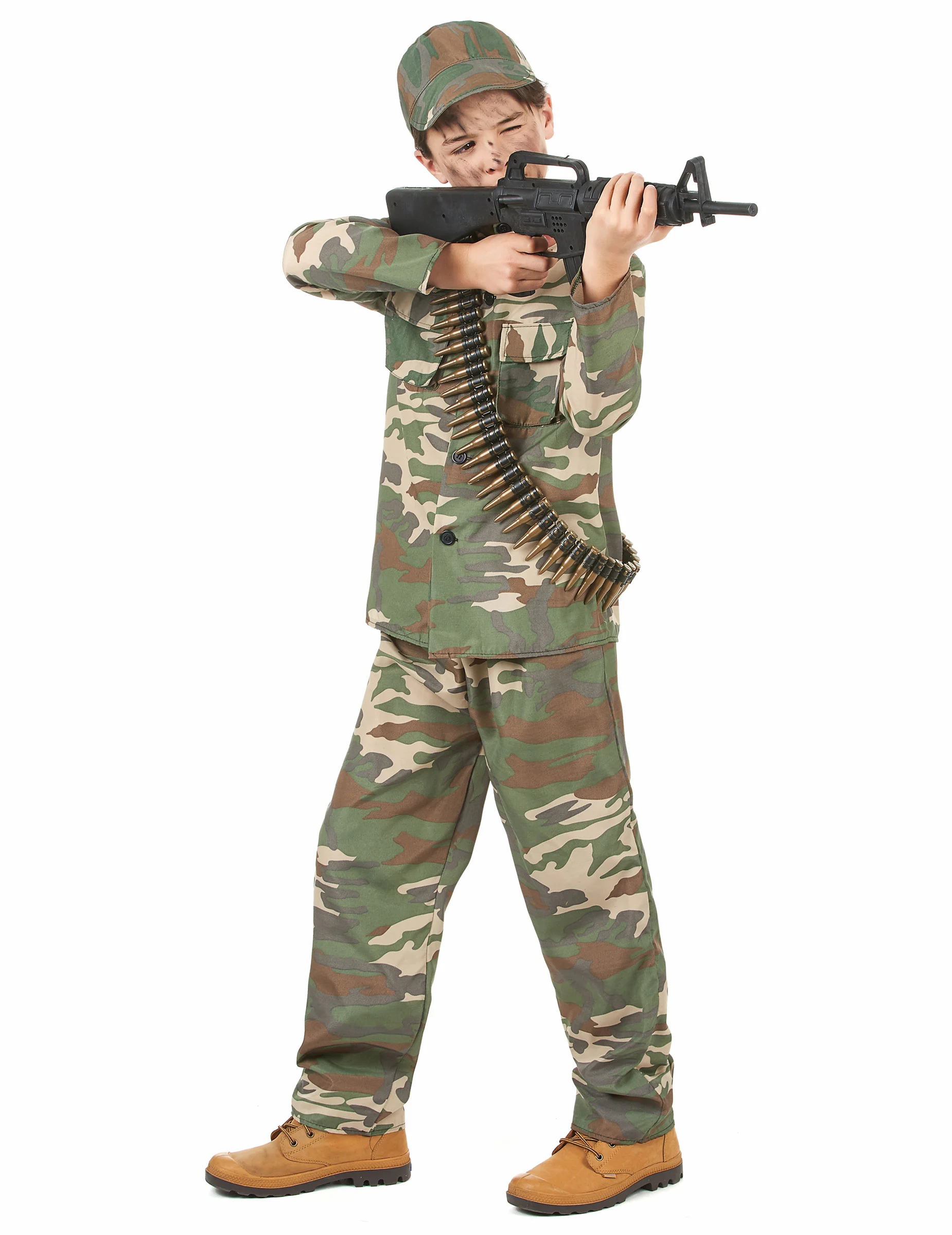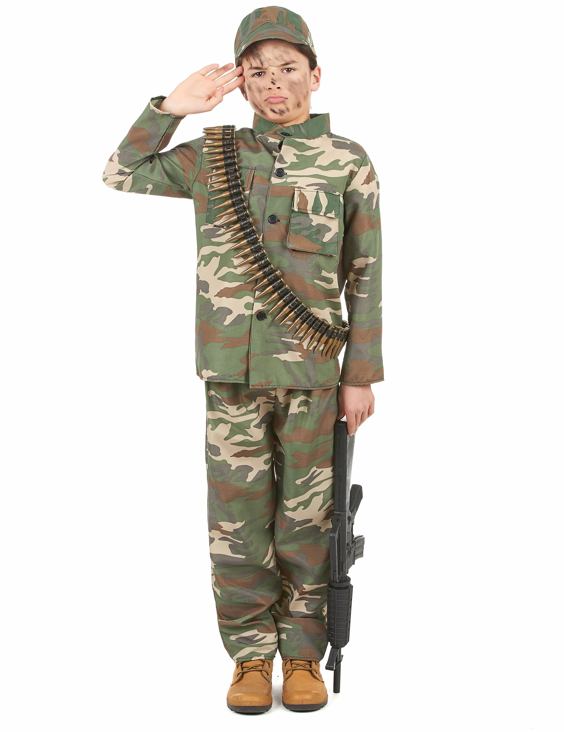 Dit militair kostuum voor jongens bestaat uit en jasje met knopen, een broek met elastische taille en een pet. Het gehele soldaten kostuum heeft een camouflage print. (Wapen en riem niet inbegrepen).