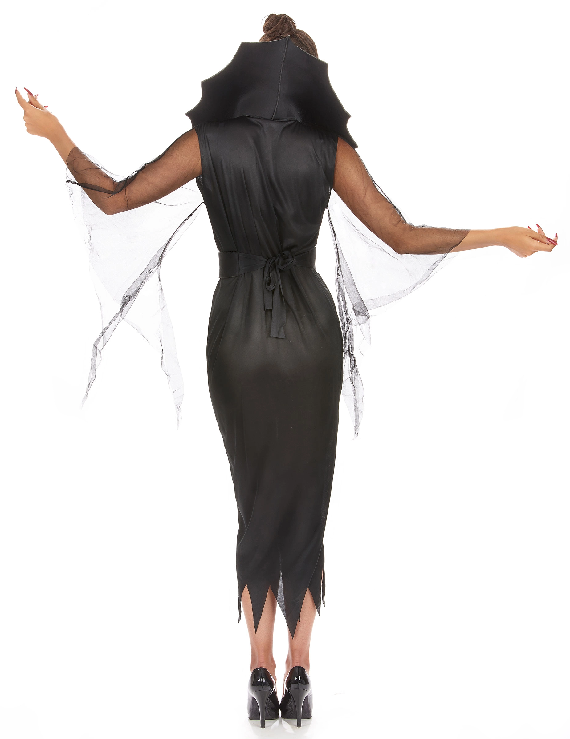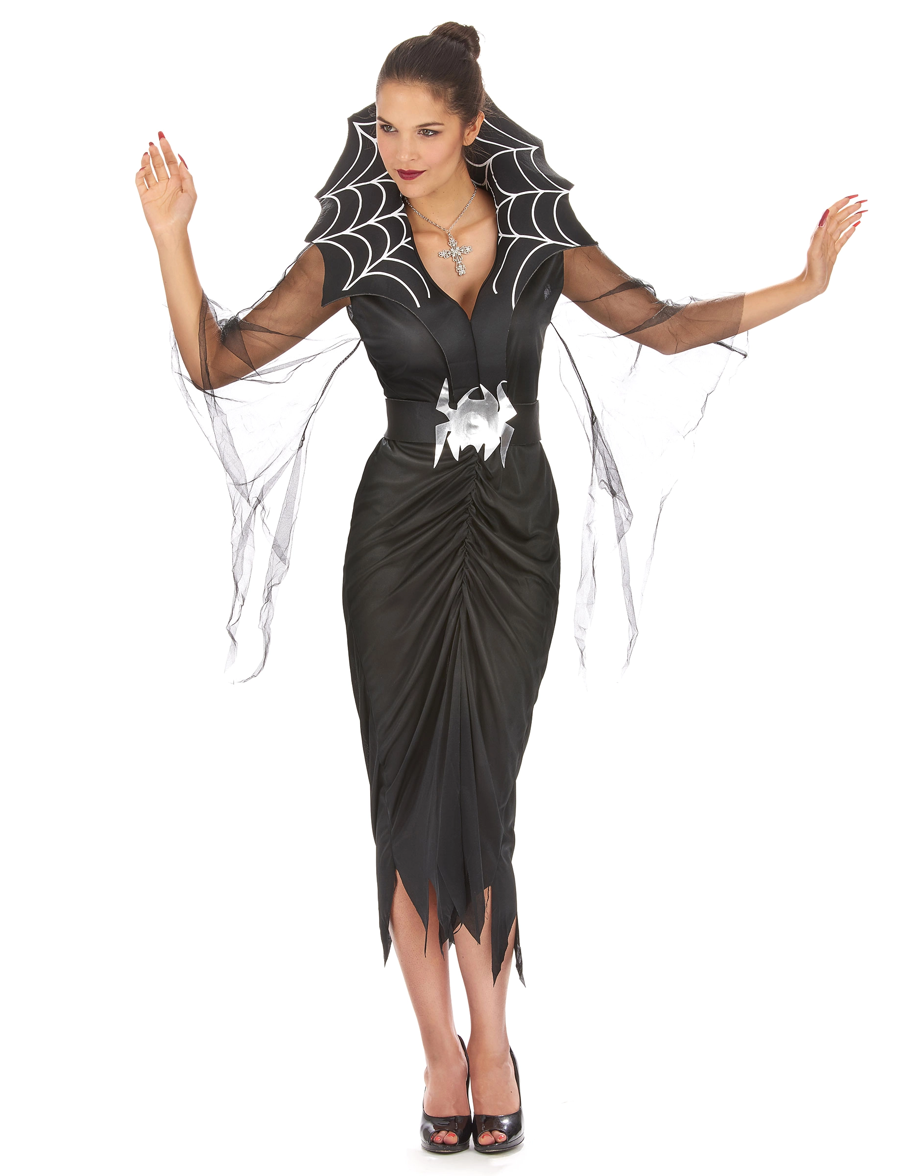 Deze Halloween spinnen outfit voor vrouwen bestaat uit een zwarte jurk met split en brede uitlopende mouwen. De grote kraag met spinnenwebmotief is van schuim gemaakt. De riem die in het midden een zilverkleurige spin heeft, is ook van schuim gemaakt (Panty, halsketting en schoenen niet inbegrepen). Wees de mooiste spin voor uw verkleedpartijtje of voor Halloween.