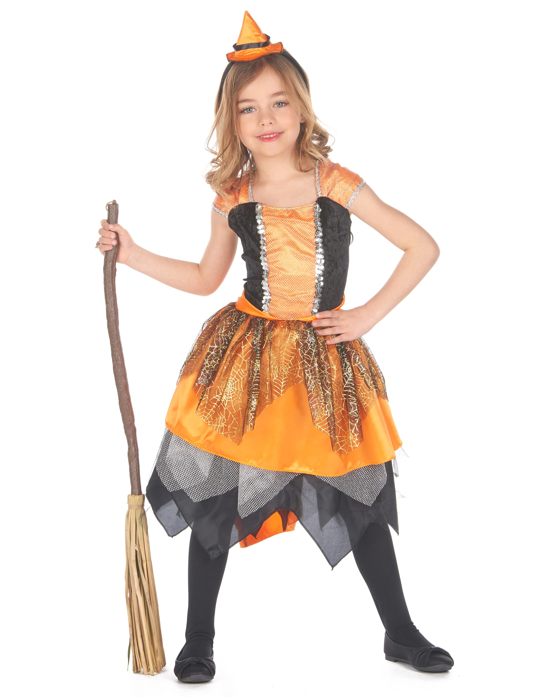 De borst is oranje en zwart met oranje mouwen. De haarband heeft een kleine heksen punthoed erop geplaatst.
