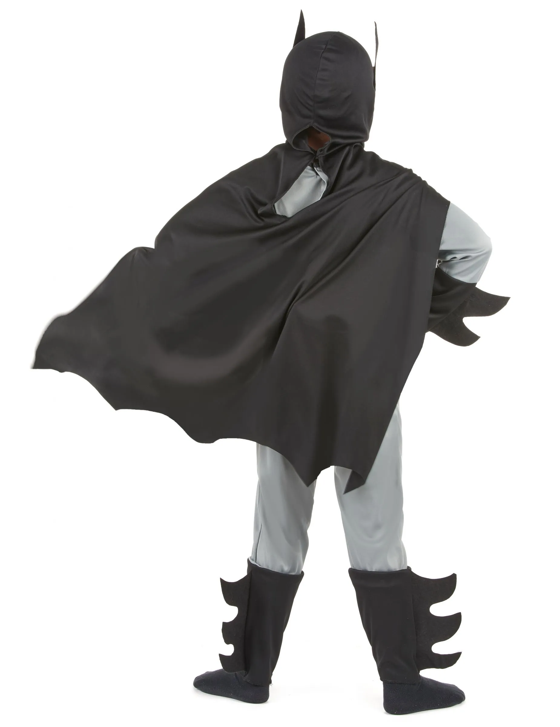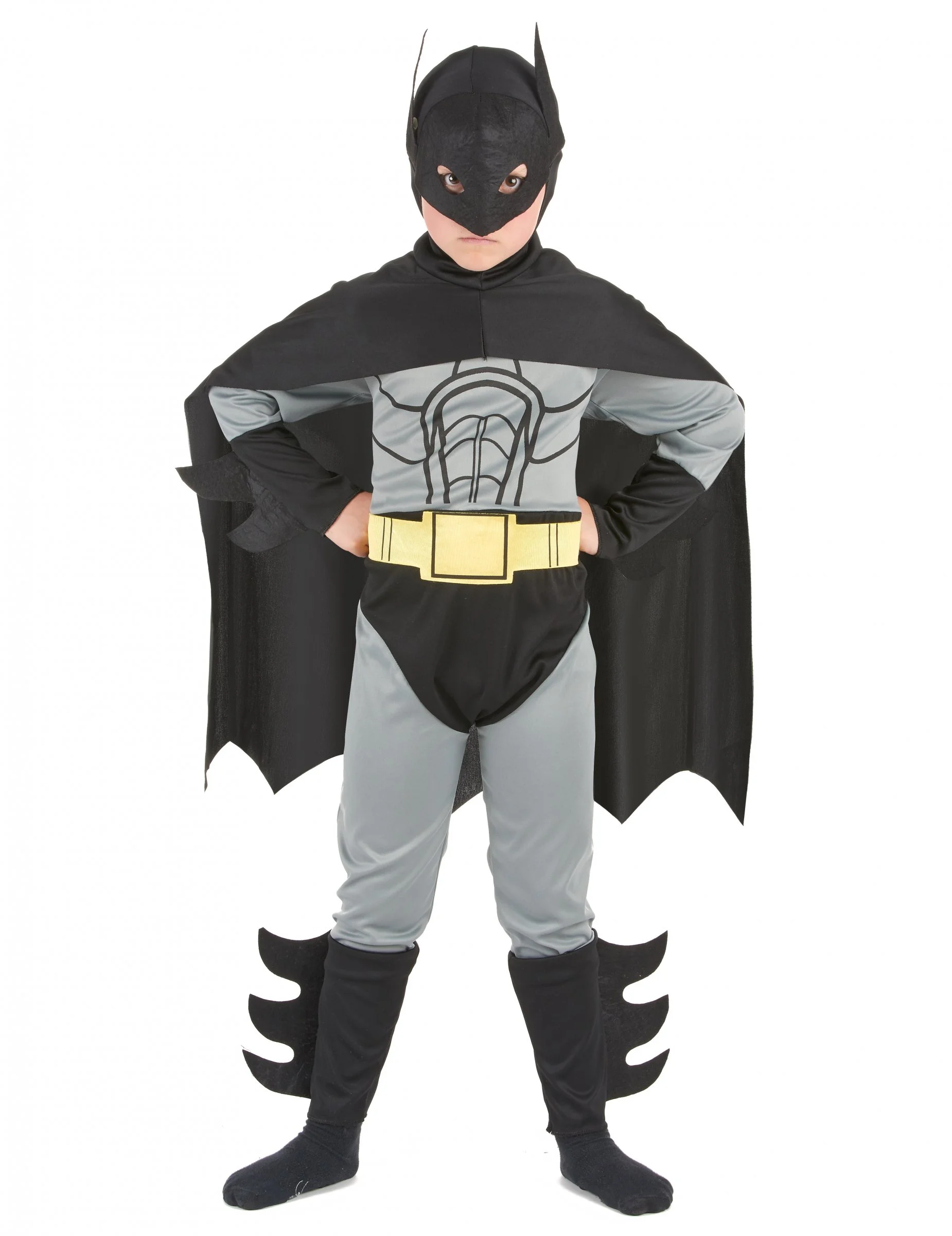 Deze vleermuis superheld outfit voor jongens bestaat uit een eendelig pak, een masker met cape en een riem. (Sokken niet inbegrepen).