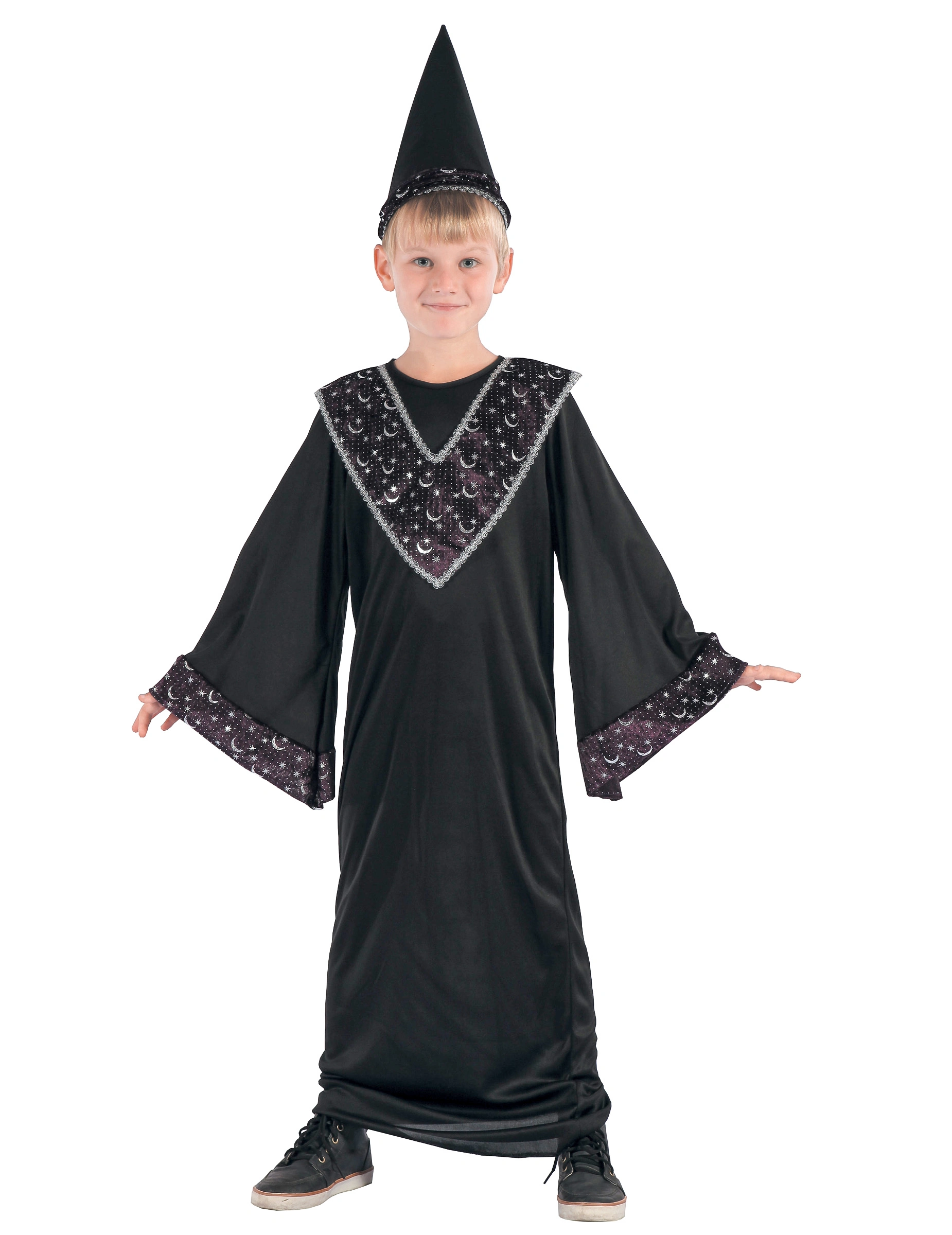 Dit tovenaar kostuum is voor kinderen. Het bestaat uit een lang gewaad en een punthoed. Het gewaad is volledig zwart. Een paarse kraag met zilverkleurige sterren is met klittenband op de schouders te bevestigen.