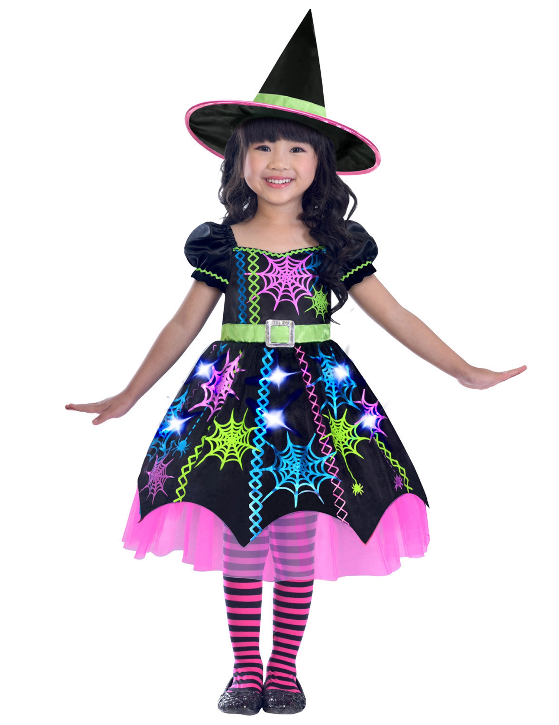 De jurk is zwart en heeft veelkleurige opdrukken in de vorm van spinnenwebben. Een groene riem is te vinden rondom de taille. De heksenhoed is zwart en heeft een groene band aan de onderkant, met een mooie roze rand.