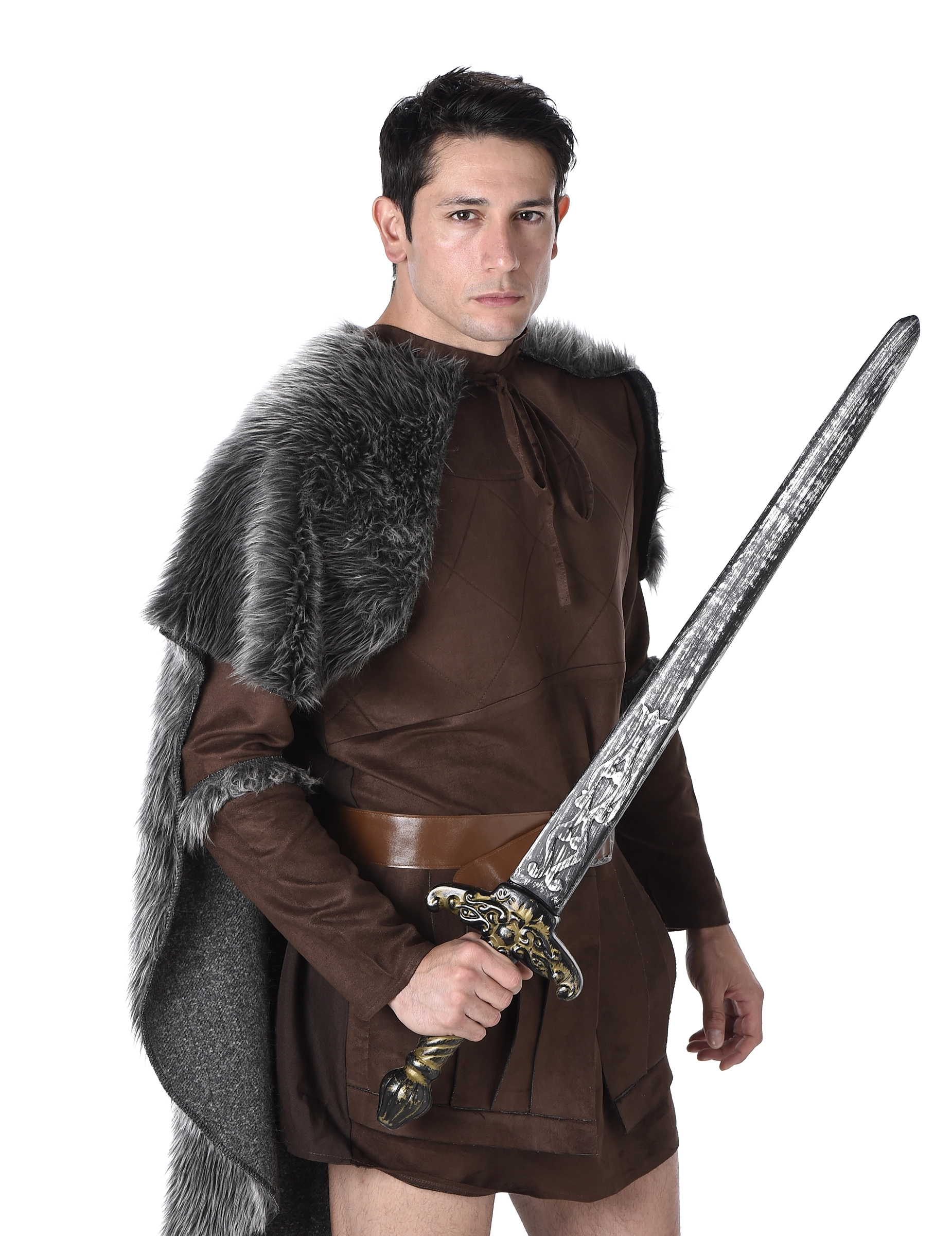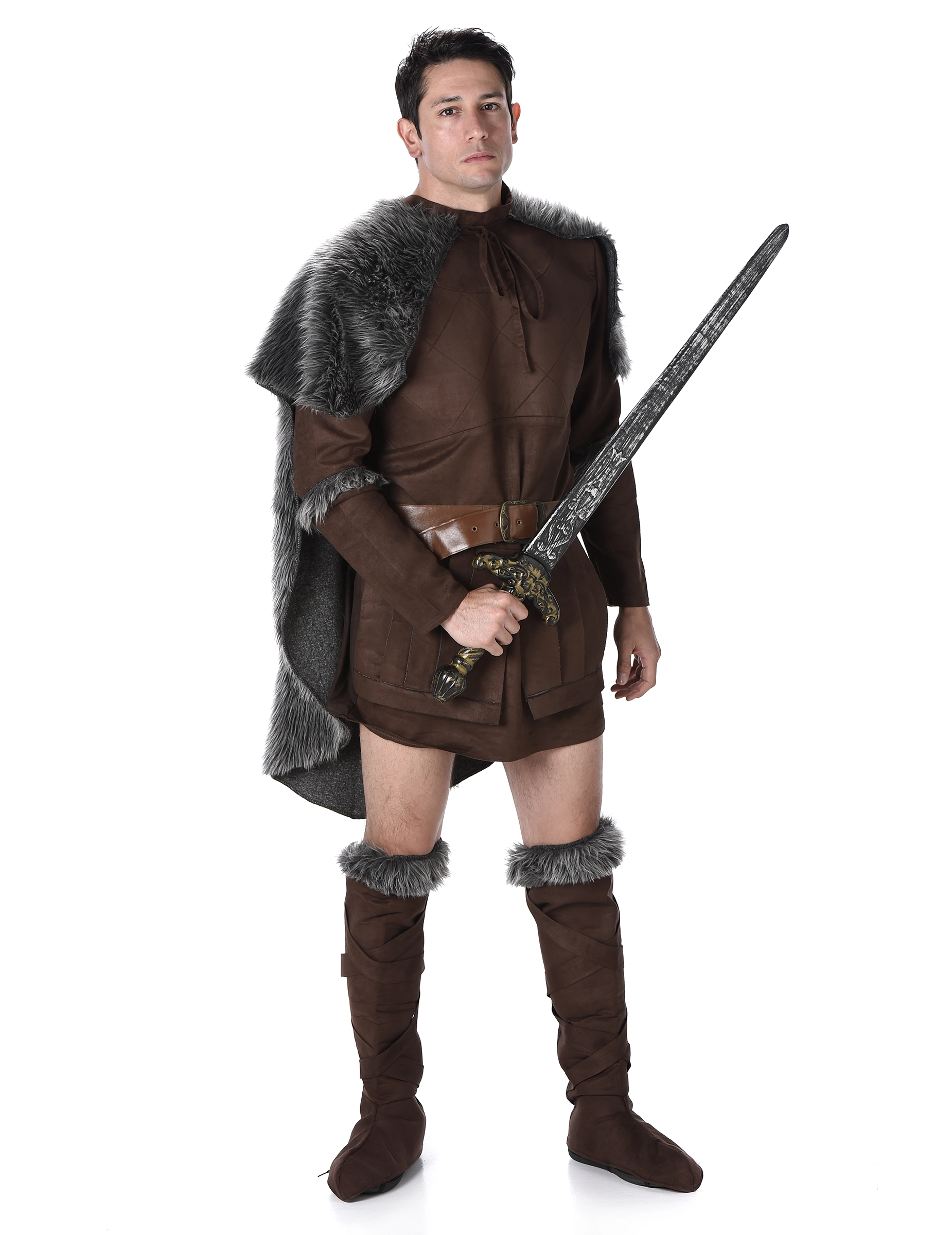 De korte tuniek met lange mouwen stelt een hoge kraag voor. Op de borst is de stof licht verstevigd met dun schuim. Aan de onderkant zijn delen schuim aanwezig. Met klittenband aan de achterkant kan de outfit makkelijk aangetrokken worden. De cape is gemaakt van grijs nepbont en kan om de nek geknoopt worden met twee touwtjes. De bruine riem van nepleer heeft een mooie ijzeren gesp. De overlaarzen hebben dezelfde kleur en stof als de tuniek en komt tot aan de knieën. Ze kunnen makkelijk om de voeten bevestigd worden met elastieken.