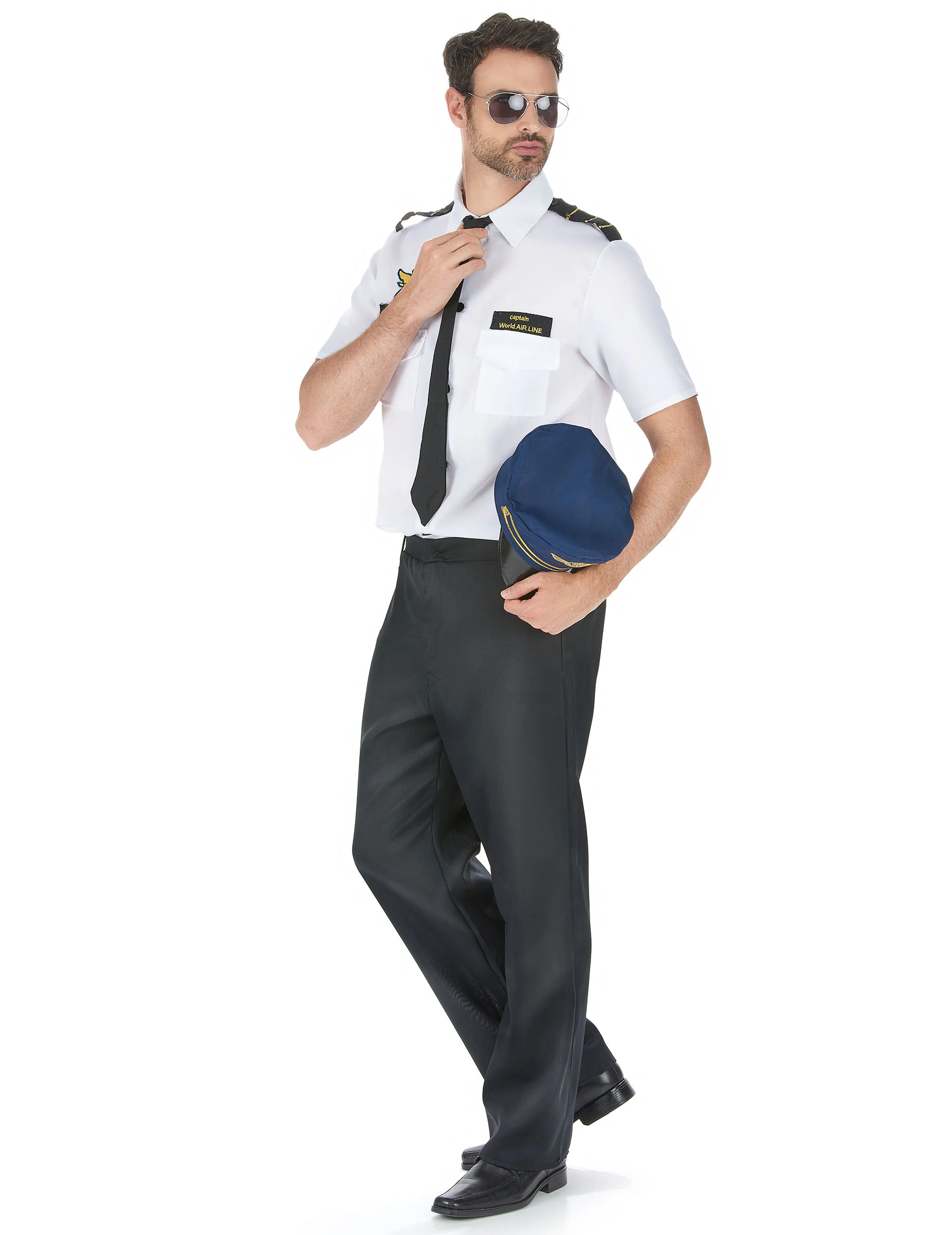 De witte blouse met korte mouwen heeft zwarte schouderstukken met gouden strepen op de schouders genaaid. Het is voorzien van 2 borstzakjes, twee naam etiketten met de tekst ” Captain World Airline” en een piloten embleem. Het overhemd kan gemakkelijk worden gedragen met de knoop sluiting aan de voorkant.