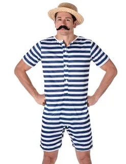 Blauw En Wit Gestreept Retro Zwem Outfit Voor Mannen