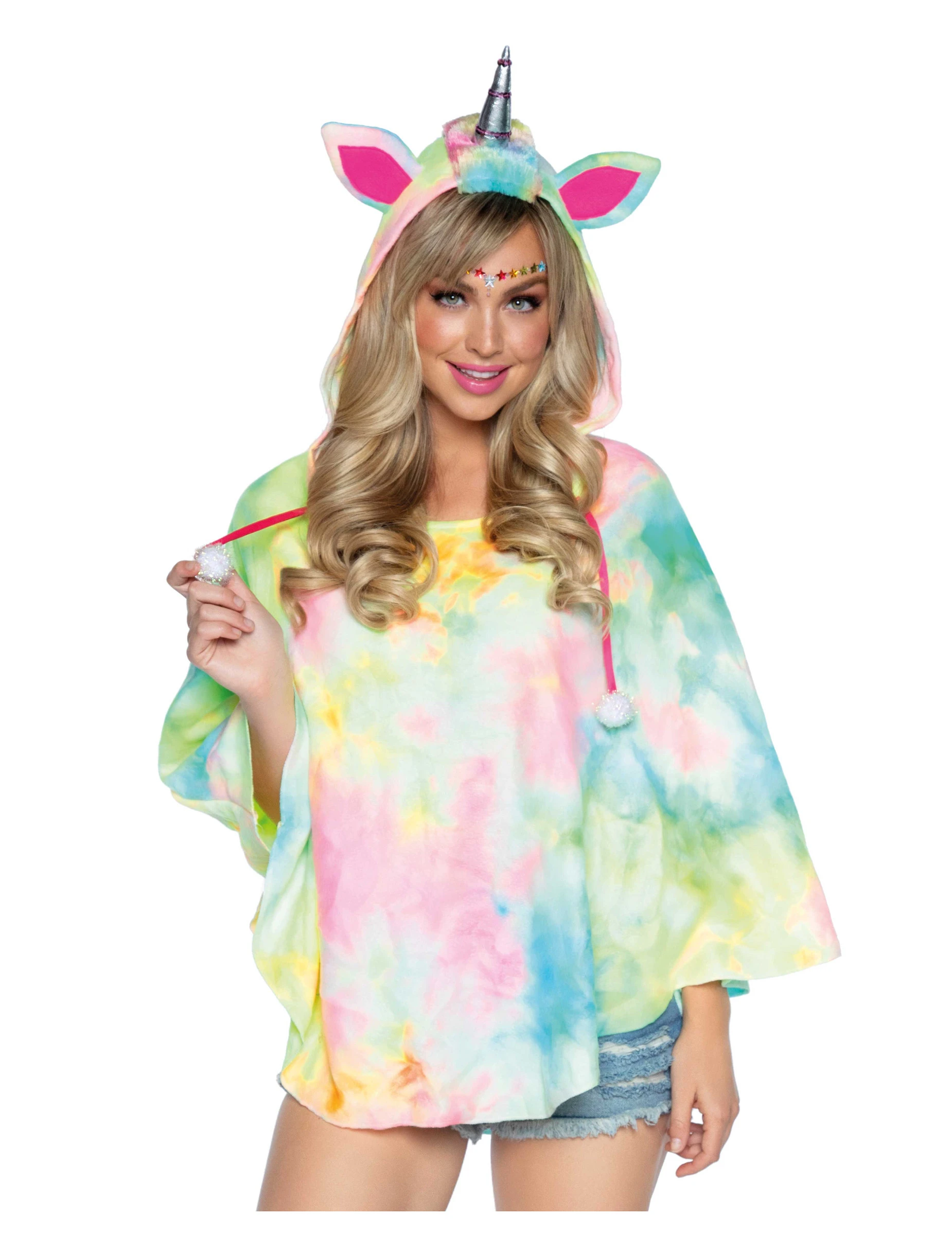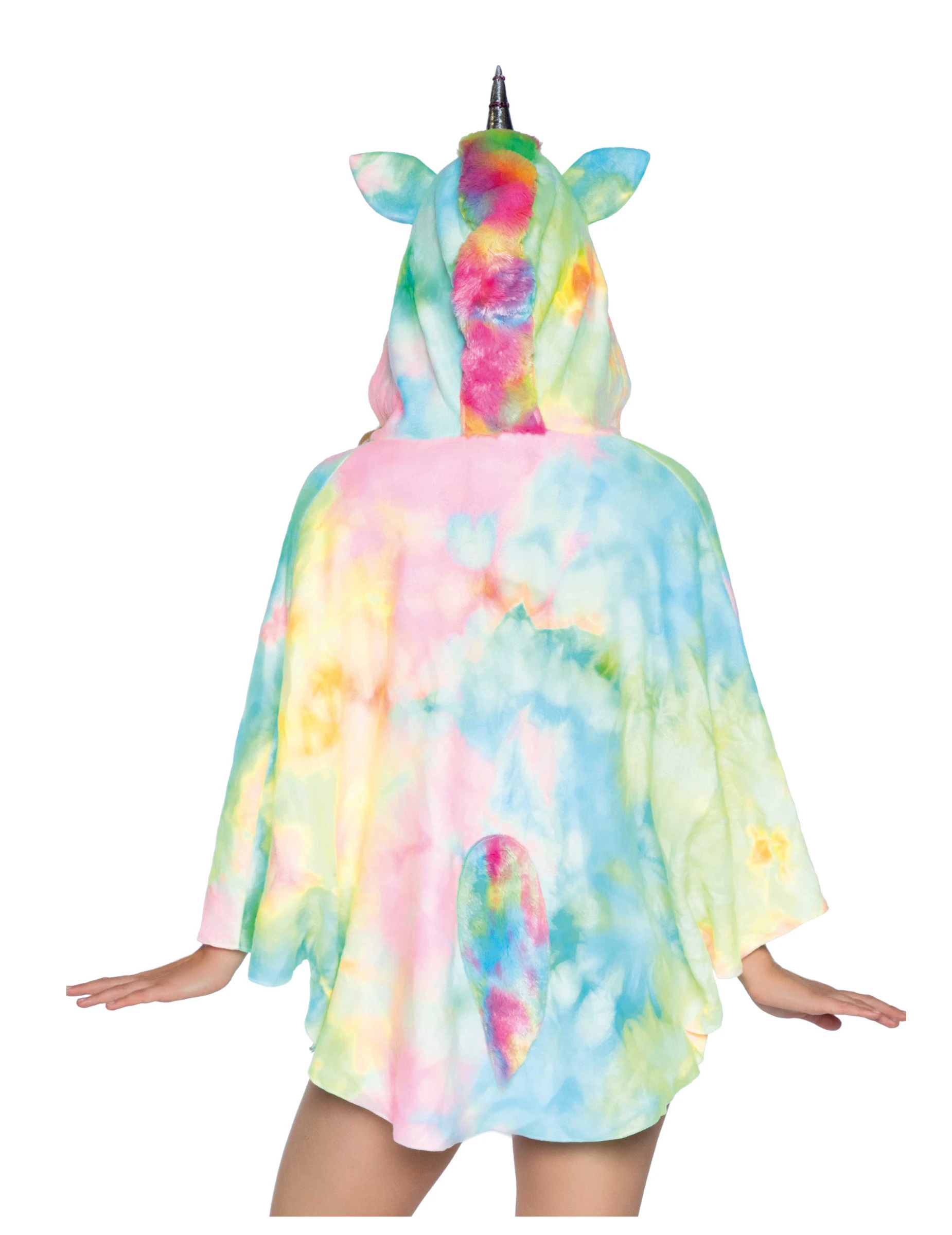 Deze tuniek is versierd met verschillende kleuren en tye and dye en heeft een eenhoornstaart op de rug genaaid en een capuchon. De capuchon heeft twee kleine oren en een zilveren eenhoornhoorn.