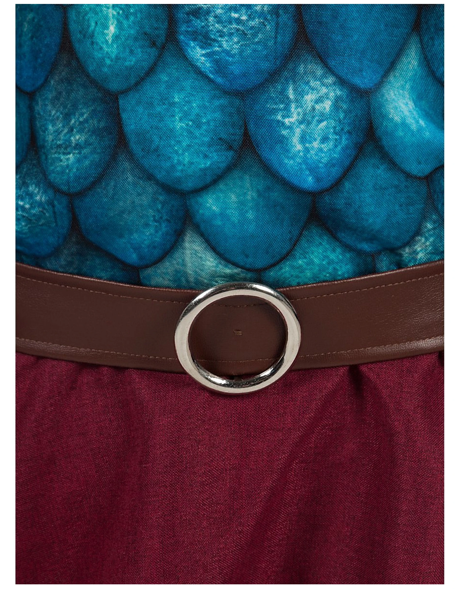 De bordeaux rode tuniek heeft lange mouwen met een witte kraag, en heeft een witte rand aan de onderkant. Het blauwe bovenstuk heeft geen mouwen. De riem en de panty maken de outfit compleet.