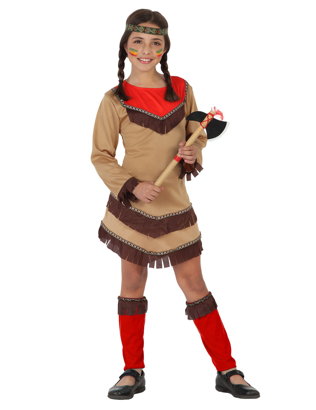 De rode en beige jurk heeft lange mouwen en is versierd met franjes en linten met patronen. De bovenkant van de jurk heeft een rode kraag en contrasteert met het beige en bruin. De indianen outfit wordt afgemaakt met een haarband met groene, rode en zwarte patronen, en rode beenwarmers met bruine franjes.