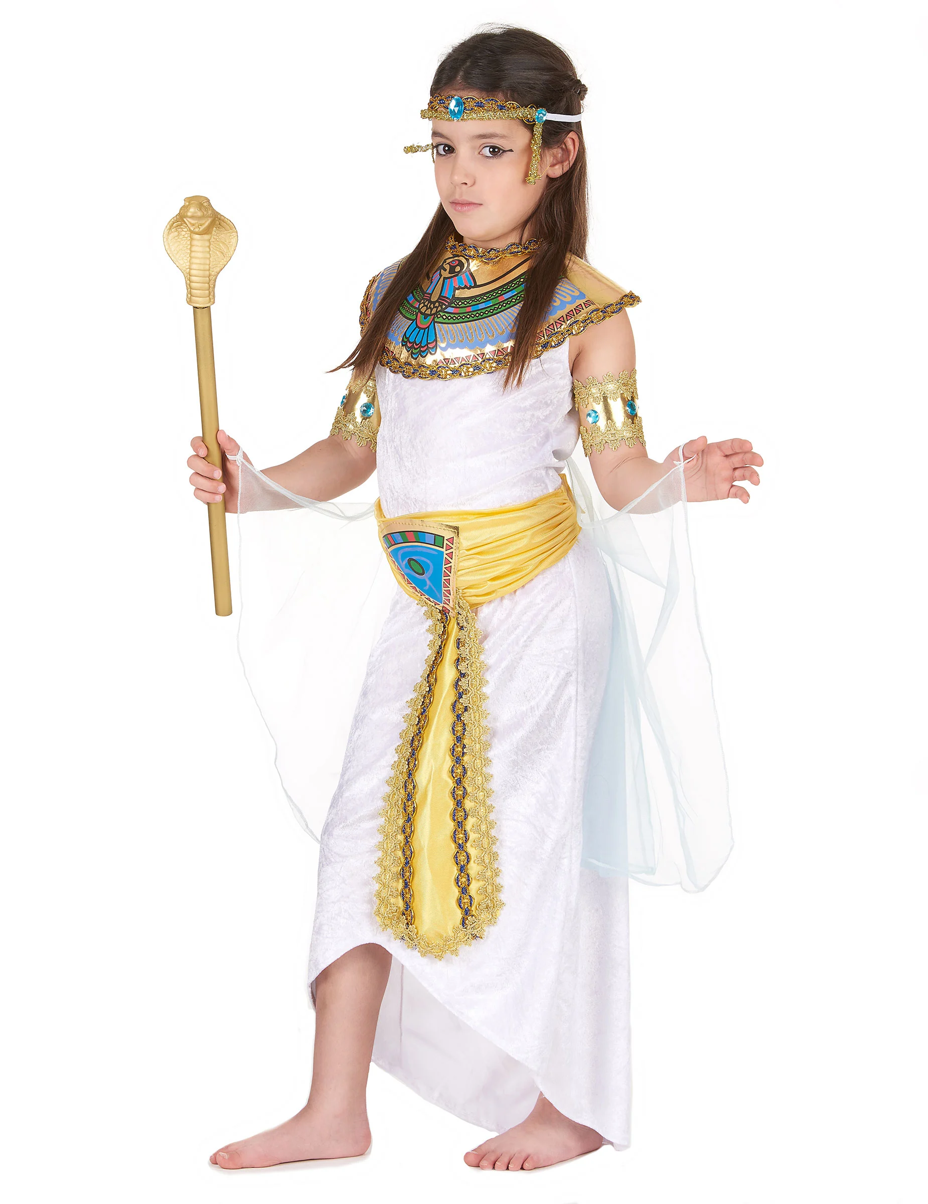 Deze Egyptische koningin outfit voor meiden bevat een jurk, een riem, een kraag, twee armbanden en een hoofdband. (Scepter is niet inbegrepen).