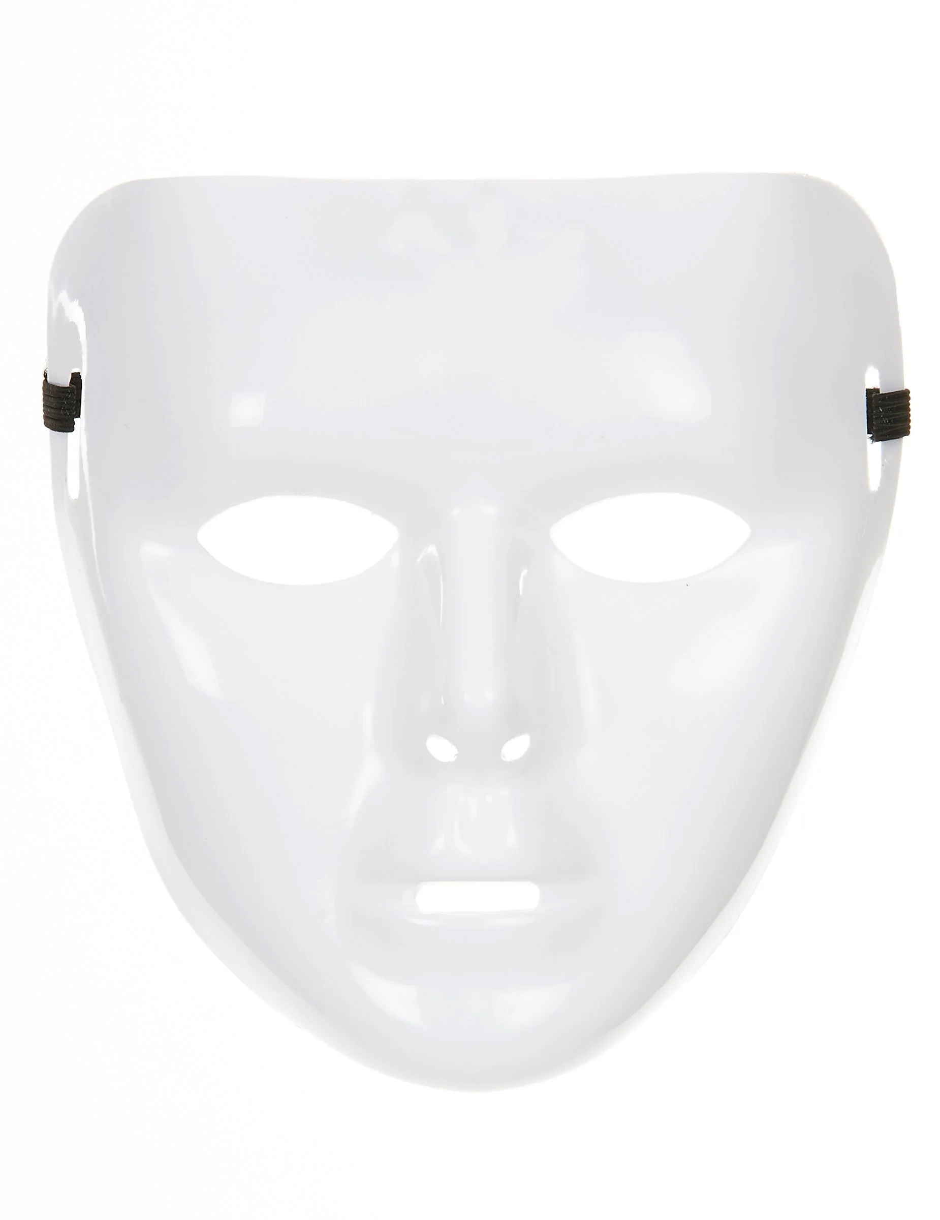 Dit witte glimmende masker voor volwassenen is van soepel plastic gemaakt.