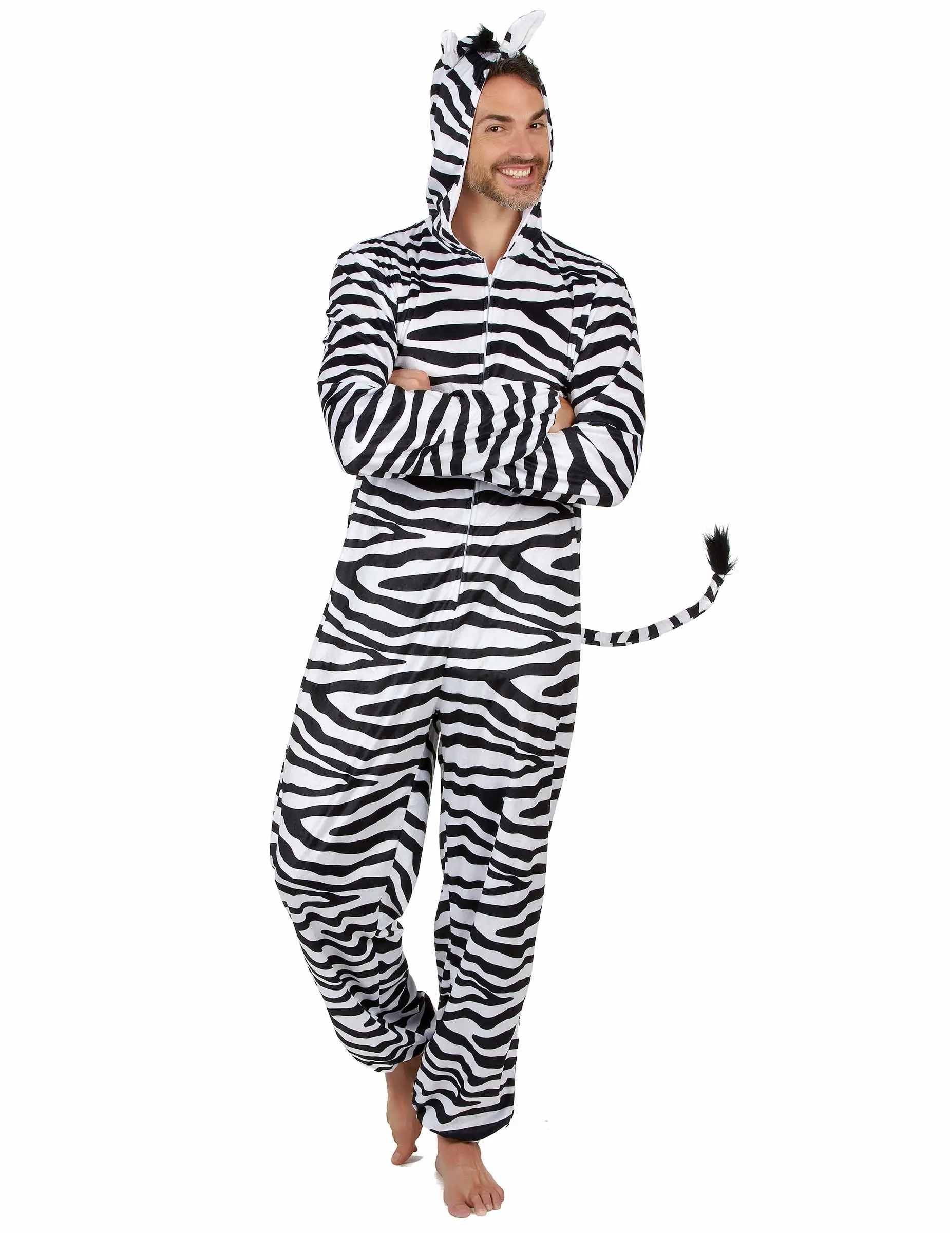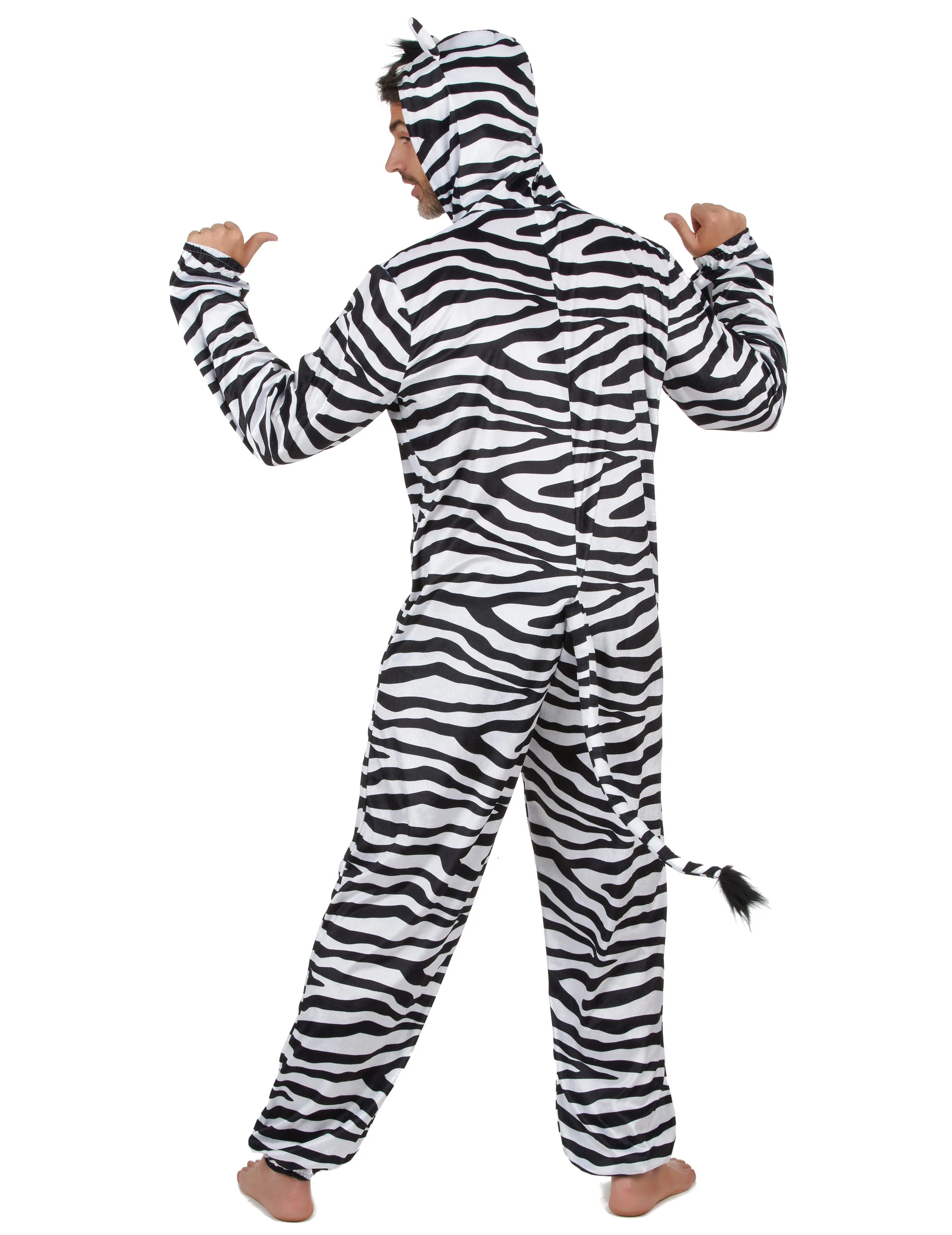 Dit zebra kostuum voor mannen bestaat uit een zacht, eendelig pak met zwarte en witte strepen. Het kan aan de voorkant gesloten worden met een rits.