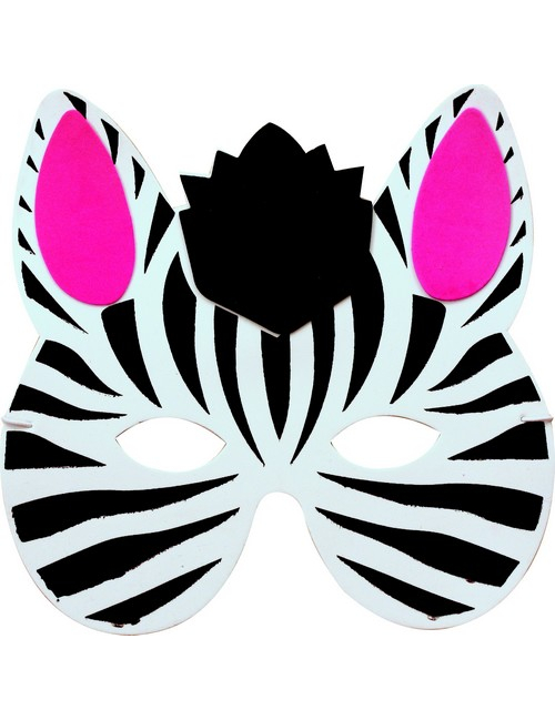 Dit zebramasker voor kinderen is gemaakt van EVA (stevig schuim). Het heeft de vorm van een witte zebrakop met zwarte strepen. De binnenkant van de oren is roze.