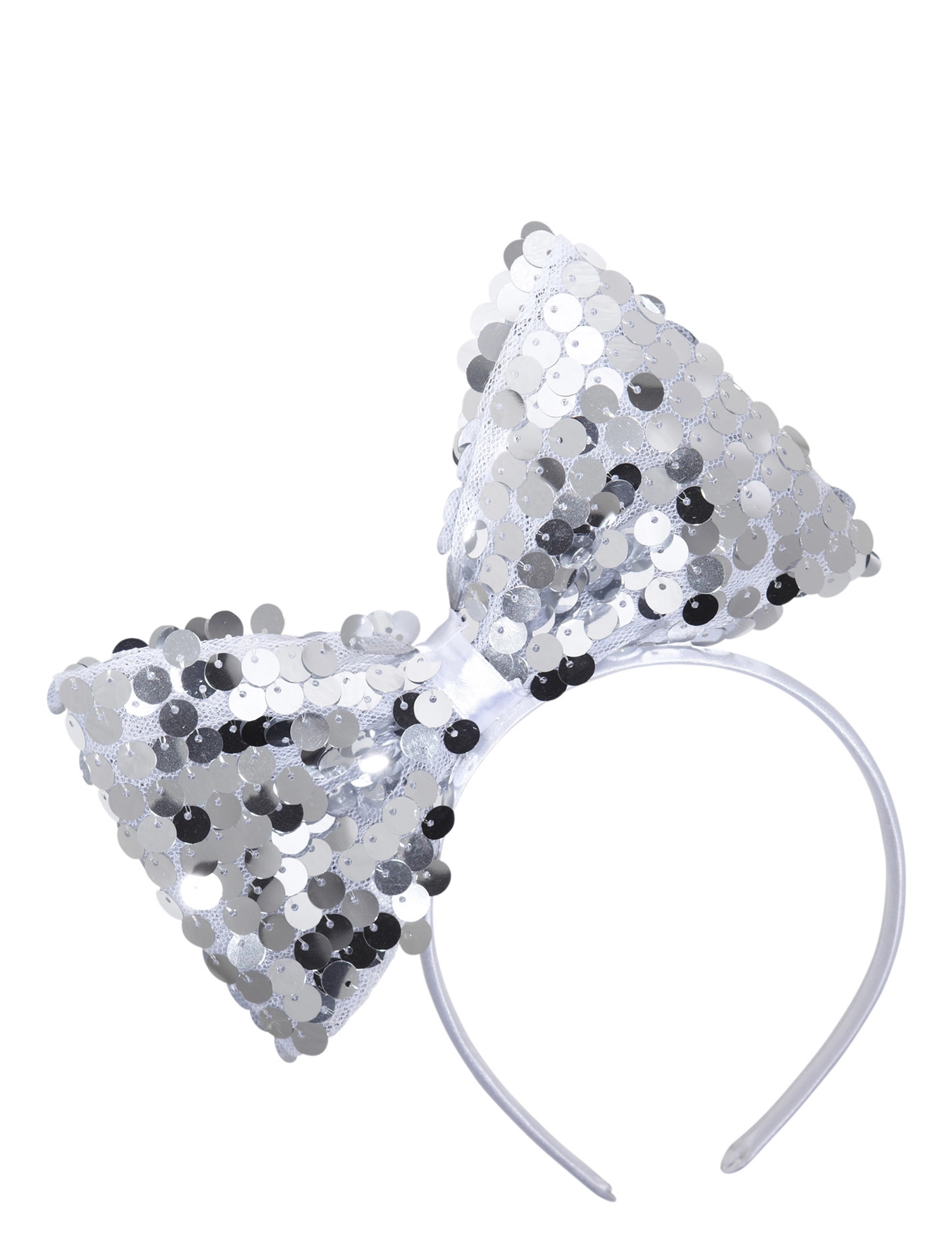 Deze haarband voor volwassenen heeft een grote zilverkleurige lovertjes strik erop geplaatst.