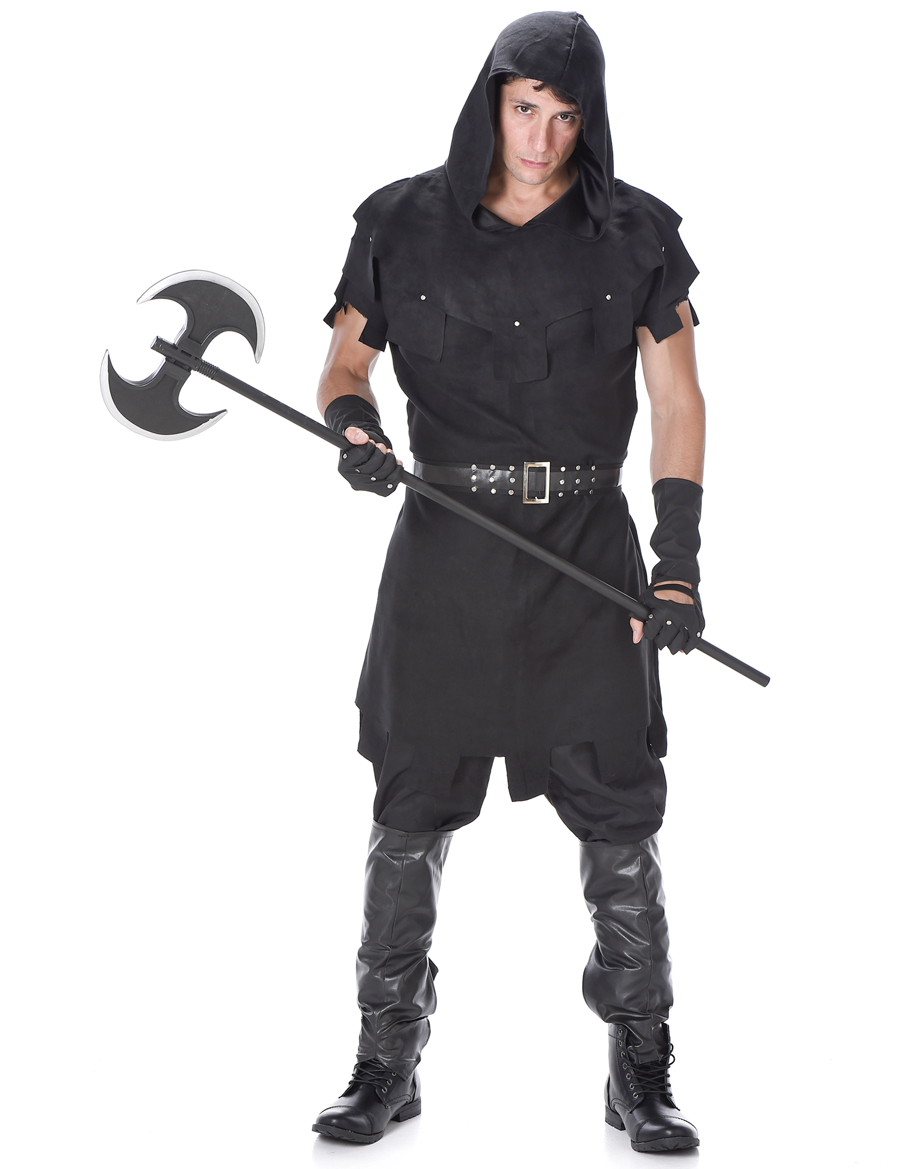 Deze beul outfit voor heren bestaat uit een tuniek, een riem, een paar handschoenen en een paar overlaarzen. (Broek, schoenen en bijl niet inbegrepen).