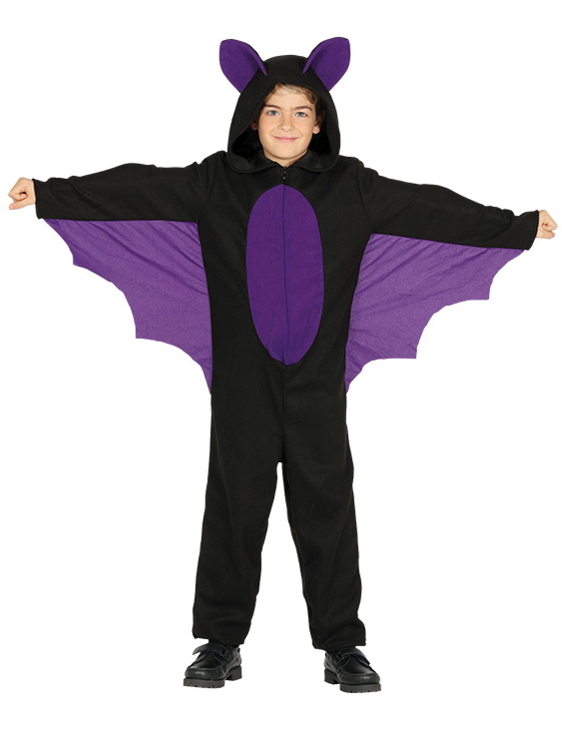 Dit vleermuis kostuum voor kinderen bestaat uit een pak. Het is zwart met een paarse buik en vleugels.