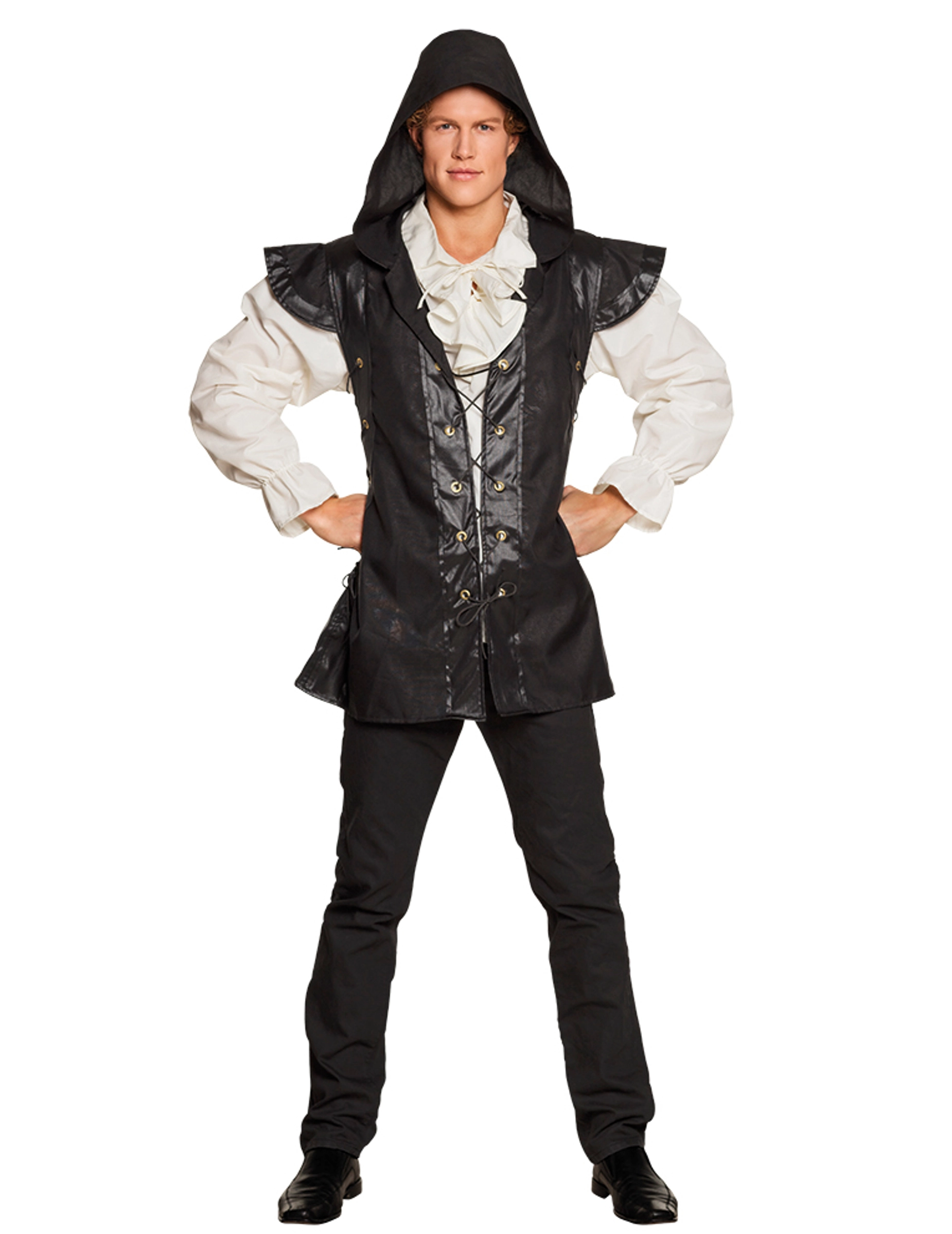 Dit boswachter dief kostuum voor volwassenen bestaat uit een vest met capuchon en een blouse. De witte blouse heeft lange, elastische mouwen bij de polsen voor een pofeffect. Het heeft een kraag met franjes.