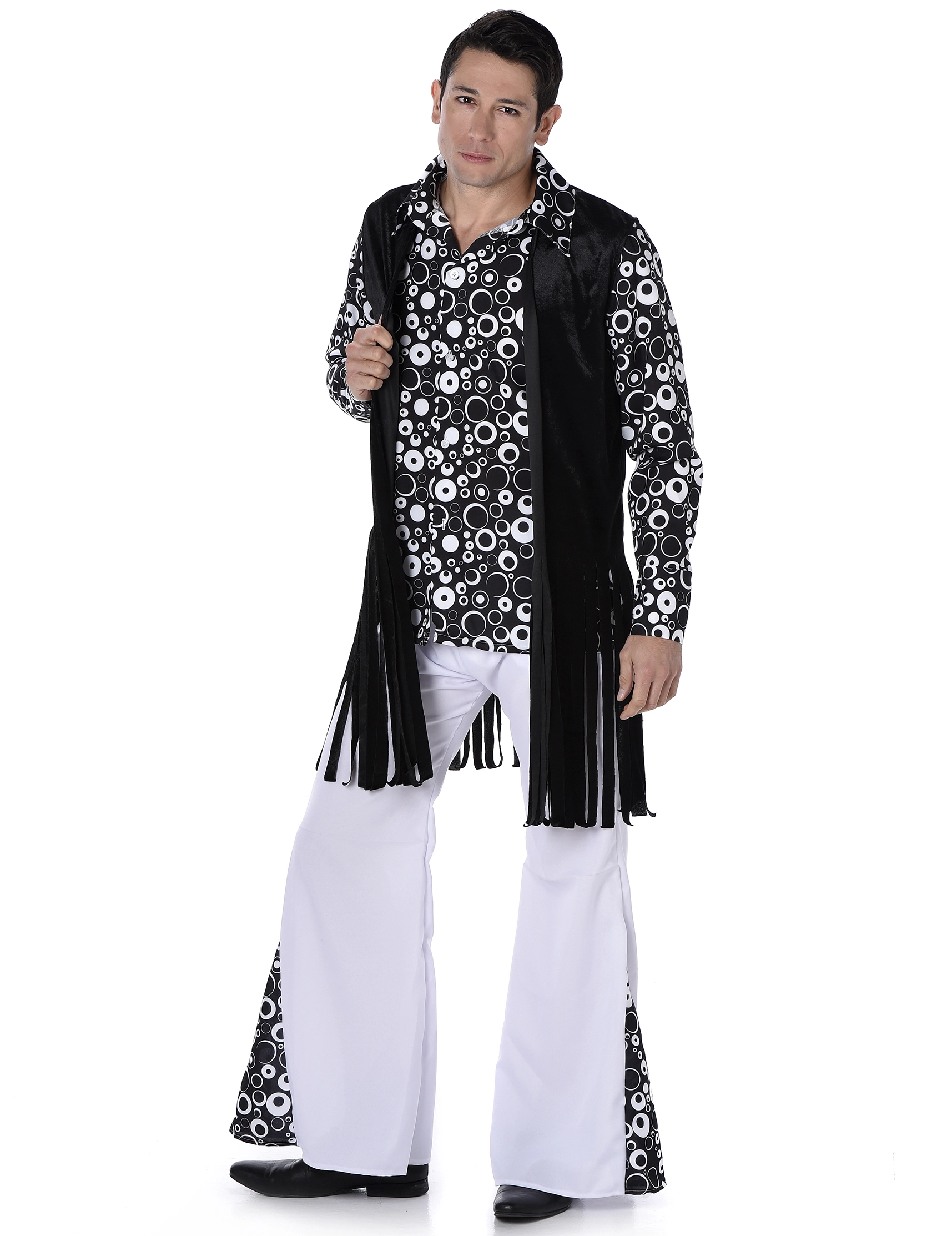 Het gehele kostuum is zwart met wit met psychedelische motieven. Het bovenstuk sluit met knoopjes en het heeft een brede kraag voor een echte jaren 70 look!
