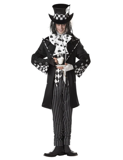 Dit hoedenmaker kostuum bevat een lange jas die tot aan de knieën komt en heeft een Victoriaanse stijl. De binnenkant van de mouwen hebben zwarte en witte patronen en mooie knopen. Het bevat een gilet met strepen aan de ene kant en ruiten aan de andere kant. De knopen passen er mooi bij en een neppe kraag bevat een zwart-wit strikje.