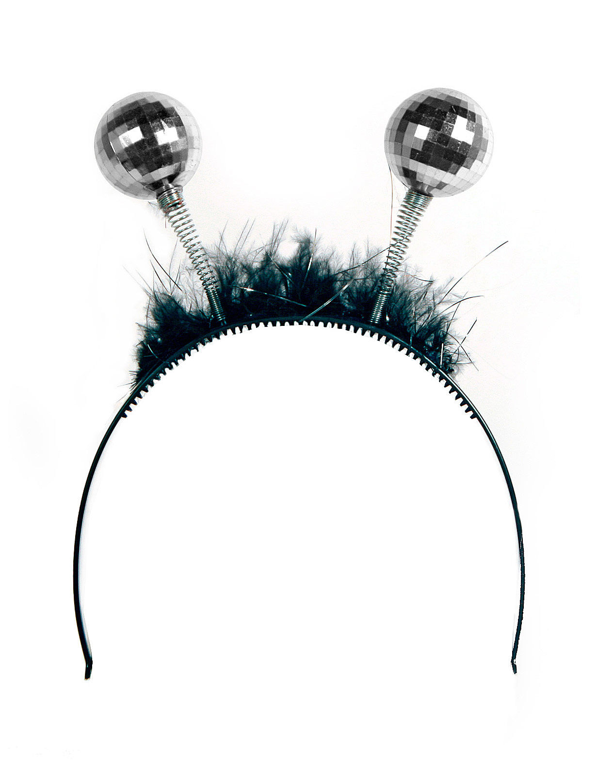 Zwarte veren en discoballen zijn erop vastgemaakt, waardoor het een ideaal accessoire is voor een glitter en glamour themafeest of oudjaar!