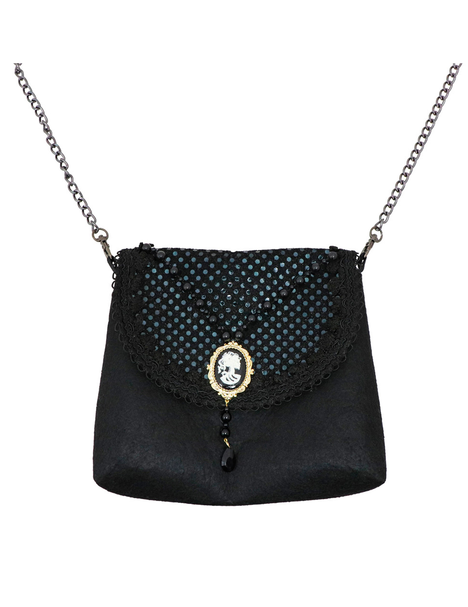 Deze tas is gemaakt van zwarte stof. De klep is versierd met grote zwarte lovertjes en afgebiesd met zwarte biezen. Kralen met een gotische broche, die aan een rozenkrans doet denken, sieren deze tas. Het handvat van deze tas is een mooie zilverkleurige metalen ketting.