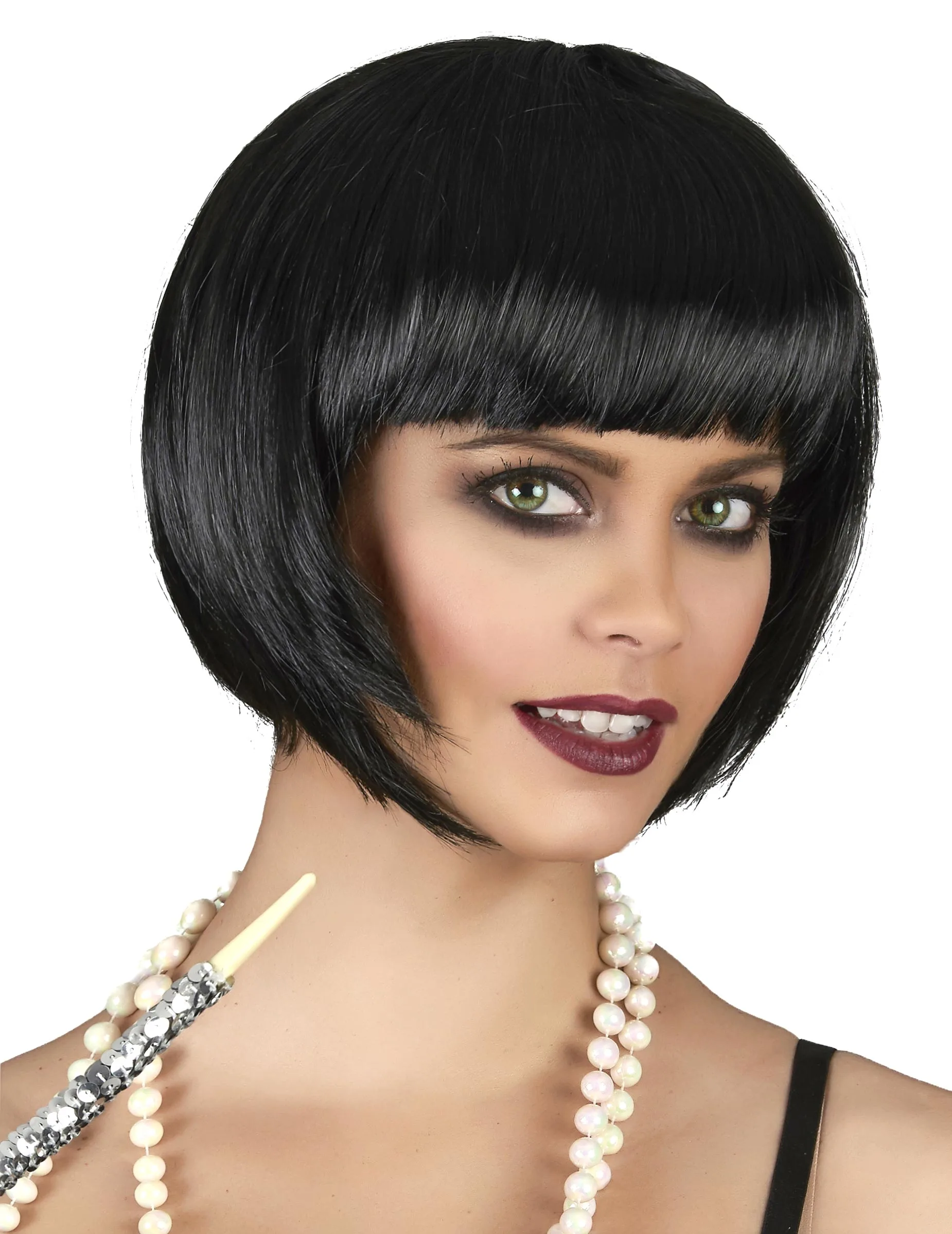 Zwarte korte glamourpruik met carré en lange pony. Deze pruik maakt uw vermomming bij verkleedfeestjes of thema-avonden compleet.