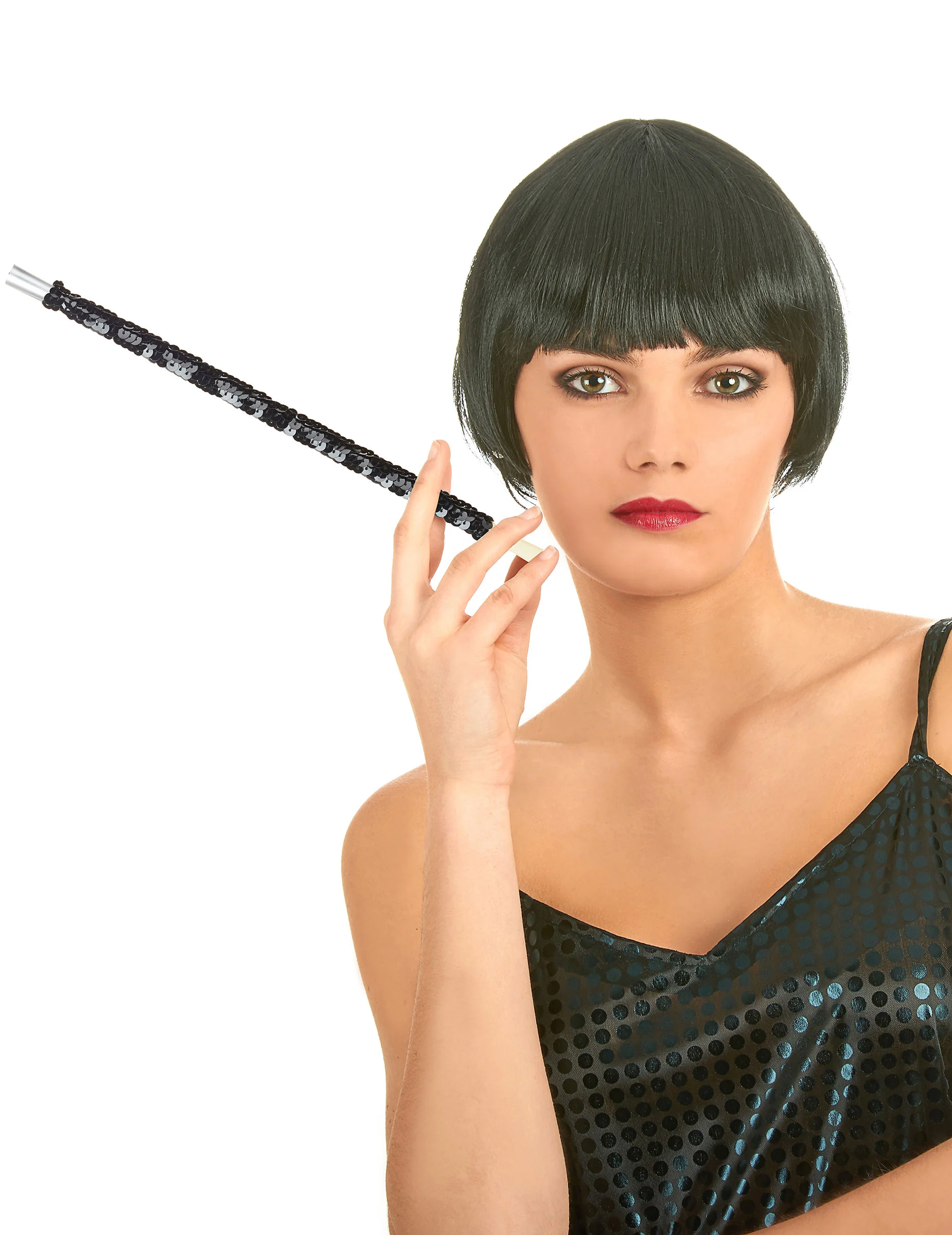 Deze zwarte sigarettenhouder voor dames is versierd met zwarte lovertjes. Ideaal om uw cabaretkostuum in jaren ’20-sfeer compleet te maken.